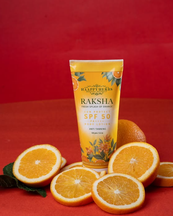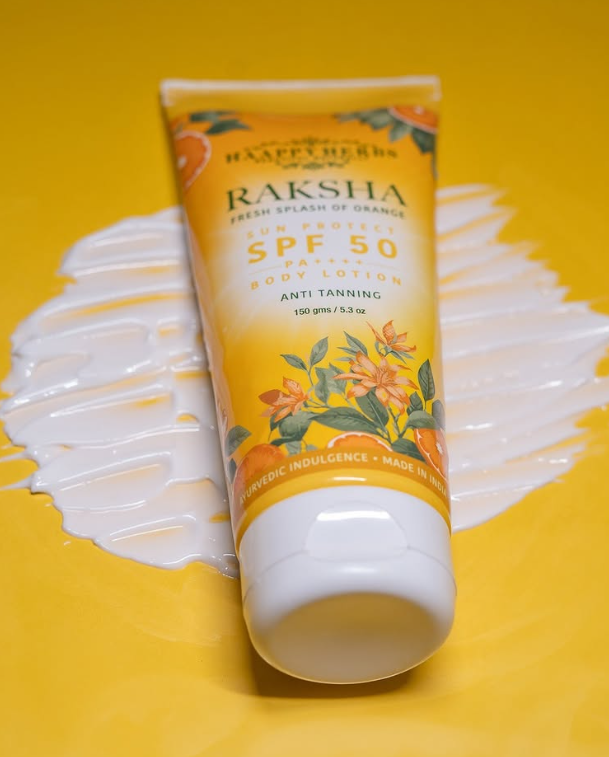 Haappy Herbs Raksha Sunscreen Body Lotion is a lightweight, hydrating formula that provides broad-spectrum protection by absorbing both UVA and UVB rays, helping to shield your skin from harmful sun exposure. Enriched with a refreshing blend of orange and ginger extracts, it leaves your skin feeling revitalized with a subtle, tangy scent.